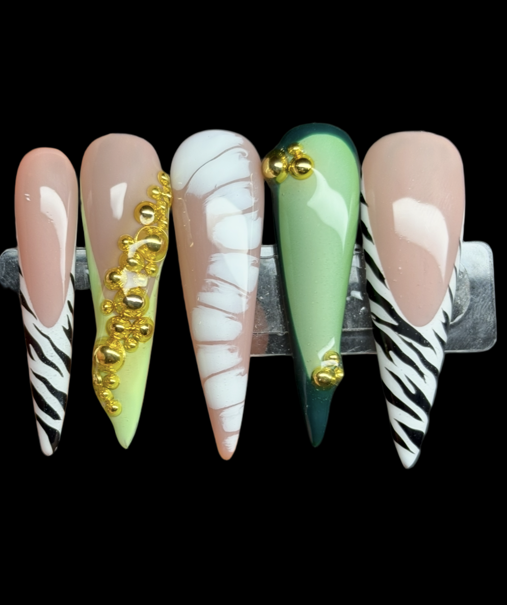 Unleash your wild side with this bold, high-fashion nail set that blends luxury with adventure. Featuring a mix of zebra print tips, soft nude bases, and vibrant green accents, this design captures both fierce and elegant energy. Gold embellishments add a touch of opulence, making every movement shimmer with confidence.